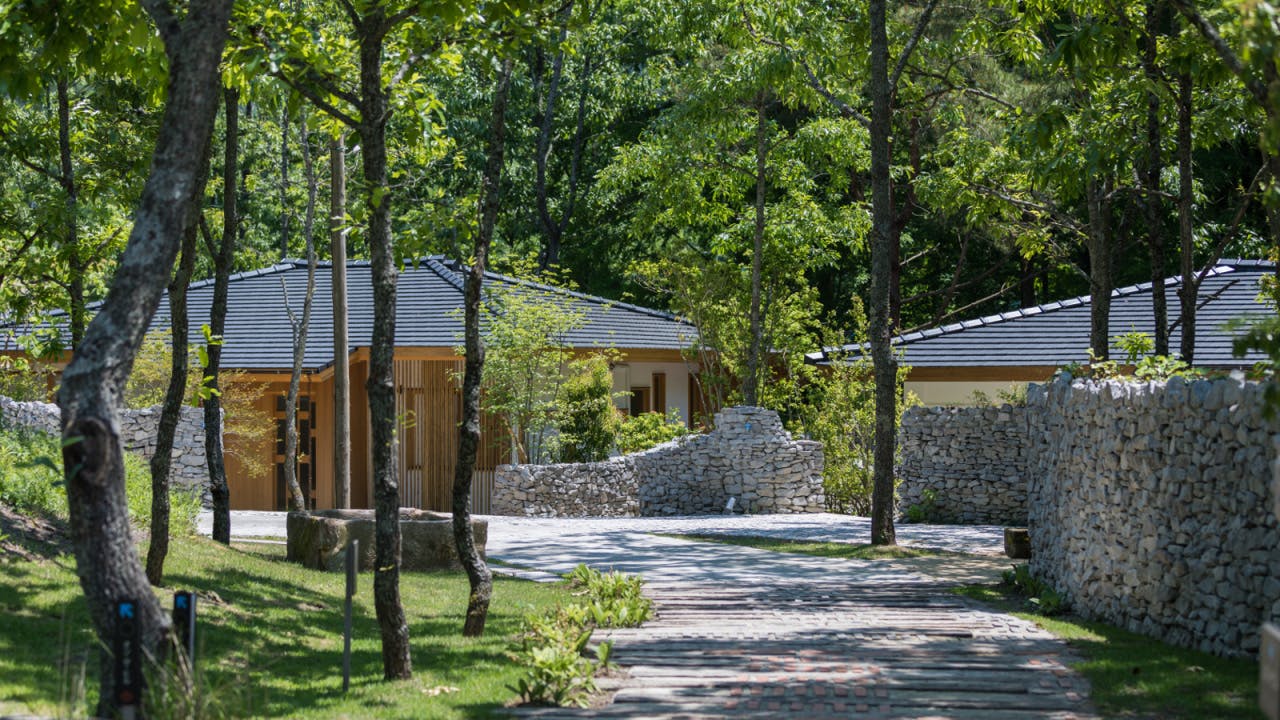 車で坂を登り駐車場へ。左側にはテラスハウス棟が見えてきます。森林に囲まれていて、静かで凛とした雰囲気。